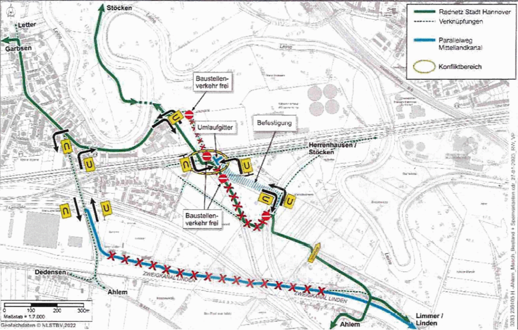 Die Deutsche Bahn lässt die Eisenbahnüberführung über den Stichkanal Hannover-Ahlem östlich von Letter seit mehreren Monaten von Grund auf erneuern. Im Zuge der umfassenden Bauarbeiten wird der Betriebsweg des Wasserstraßen- und Schifffahrtsamtes, der nördlich des Stichkanals verläuft, von Sonnabend, 1. November, bis voraussichtlich Sonnabend, 31. Januar 2026, erneut vollständig für den Fuß- und Radverkehr gesperrt. Grund dieser Sperrung sind weitere Arbeiten an der 1909 erbauten, zweigleisigen Brückenkonstruktion. Die Sperrung betrifft den gesamten Abschnitt des Weges im Bereich der Eisenbahnüberführung. Eine Umleitung für den Fuß- und Radverkehr wird eingerichtet und entsprechend ausgeschildert.
