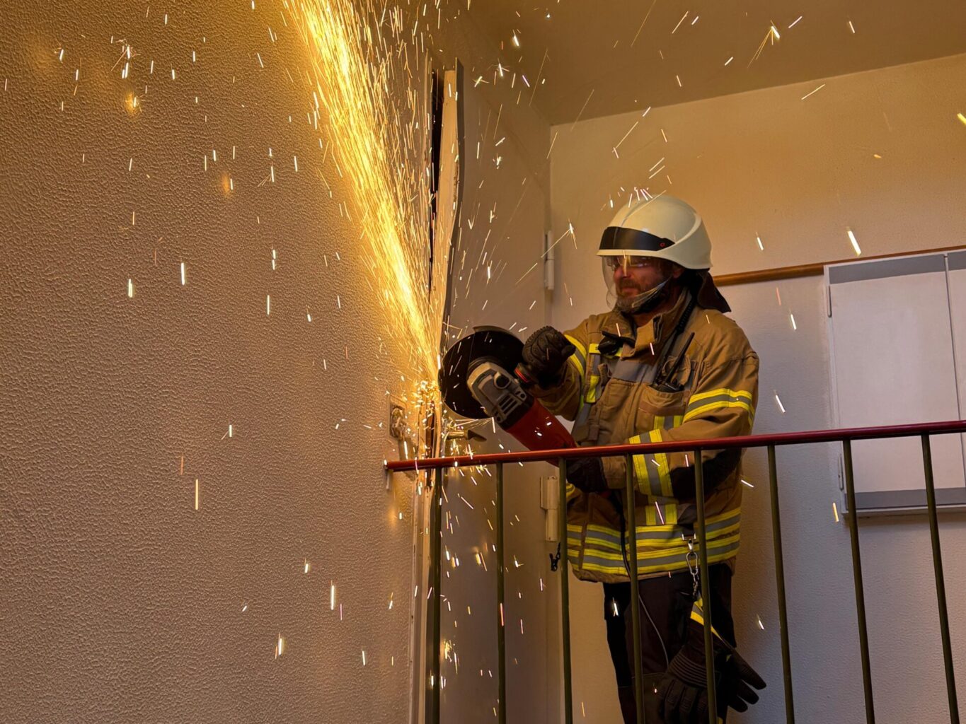 Ortsfeuerwehr öffnet Tür für hilflose Person mit Trennschleifer